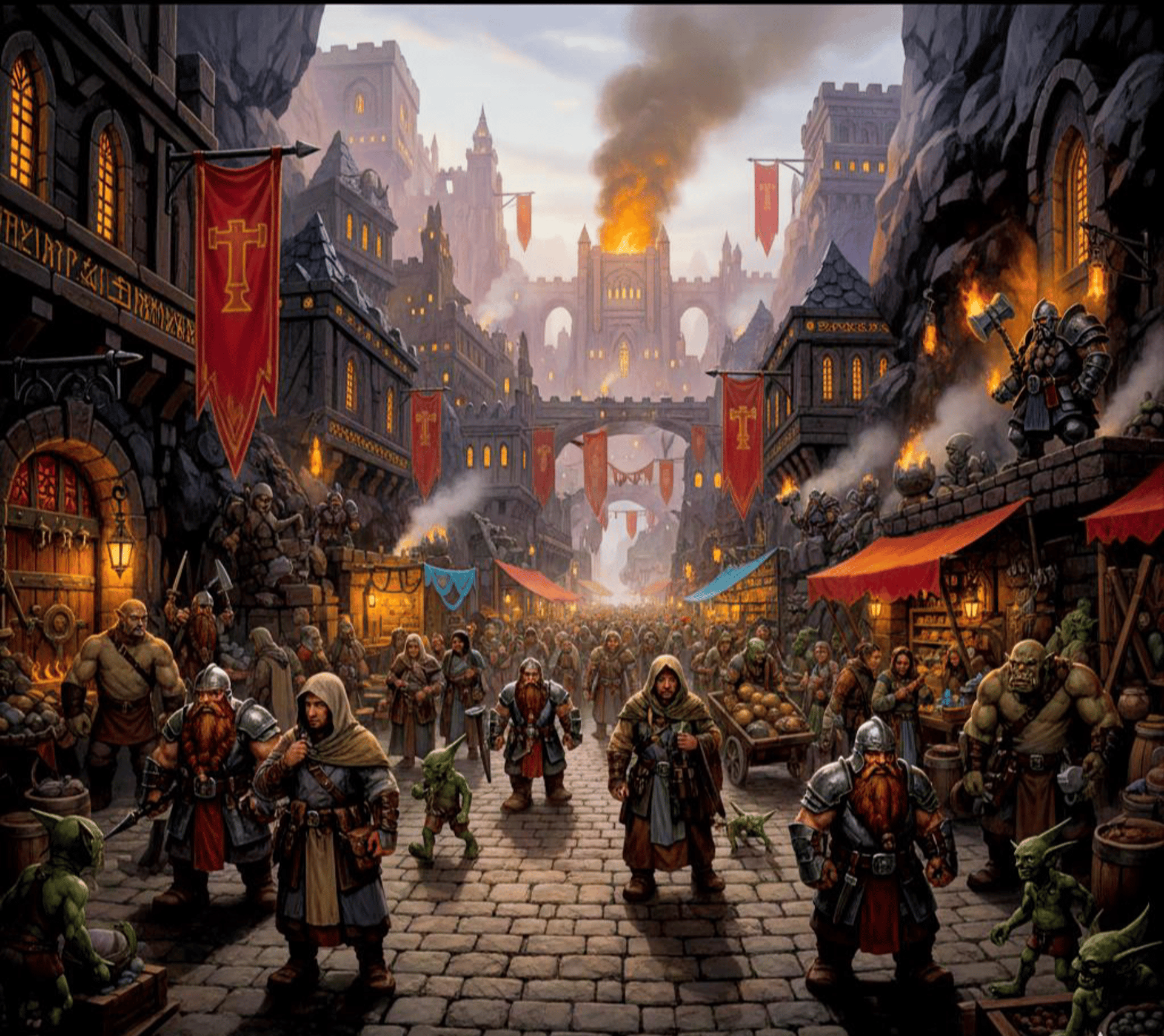 The Market: The market in Hammerdeep is a constant, cavernous clamor where the forge's roar meets the merchant's haggle, smelling richly of coal smoke, sharp whetstones, and imported Greenriver spices traded for dwarven iron and polished gems.