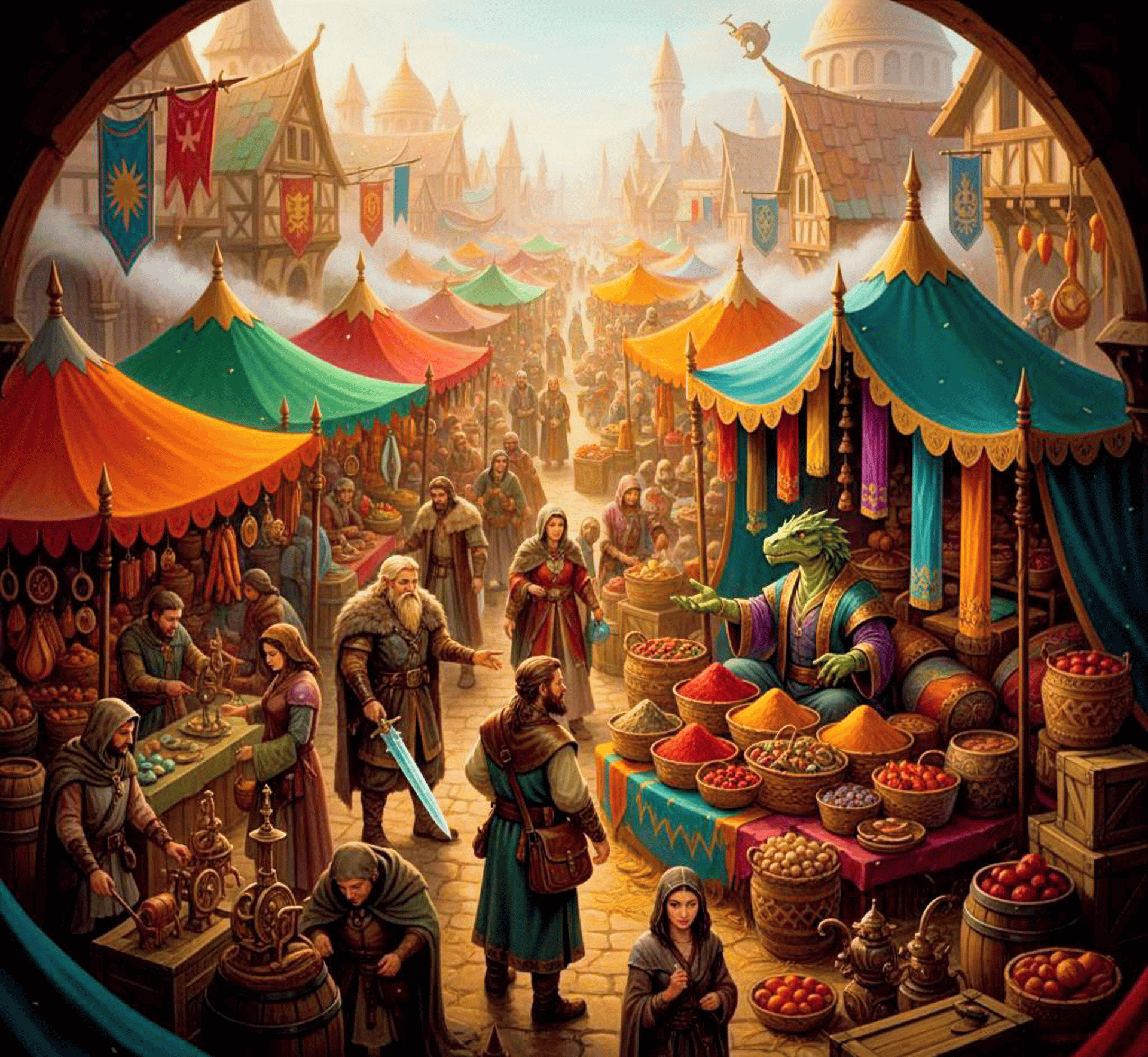 You've found the jewel of Port Sunder! Forget the docks, this is where the real trade happens. The Grand Market is a sprawling, chaotic, and glorious ocean of sound, color, and commerce. Tents of every conceivable color stretch as far as you can see, and the air is a dizzying perfume of Keshian Blood Spice, Skarosian sun leaf, smoked fish, and a thousand other things. Here, you can find anything, from a single star-ice blade from the frozen north to a clockwork toy from a gnomish mountain city.