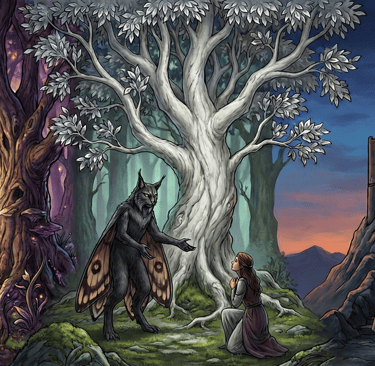 It stepped forward. It had the face of a lynx but the eyes of a human woman. Its skin was the texture of bark. It wore a cloak made of living moth wings.