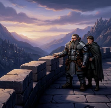(The wind howls across the high battlements, biting through your tunic. A dwarf with a beard the color of iron stands beside you. He does not look at you; his eyes are fixed on the darkness of the valley below. He hands you a heavy, rough-spun grey cloak.)